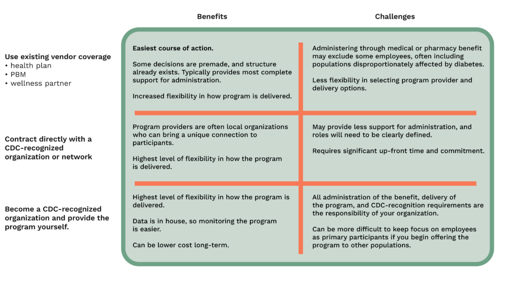 You learned earlier about various ways a benefit for the National DPP lifestyle change program may be administered. This graphic gives you a good overview of those options.